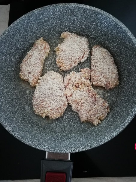 • Обмакиваем мясной кусочек в яйце, затем в сухарях и кладём на разогретую сковороду. Жарим до золотистой корочки.