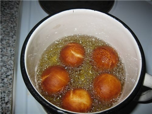 • В кастрюльку с горячим растительным маслом погружаем первую порцию шариков, деревянной ложкой помогаем им всплыть. Жарить лучше на среднем огне, дав им прожариться внутри и не дать сгореть снаружи. Жарим до золотистого цвета.