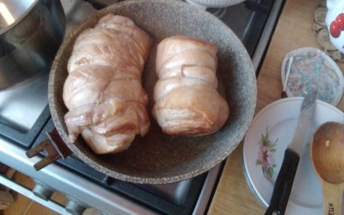Готовый рыбный слева сверху, свиной слева снизу и куриный справа снизу.