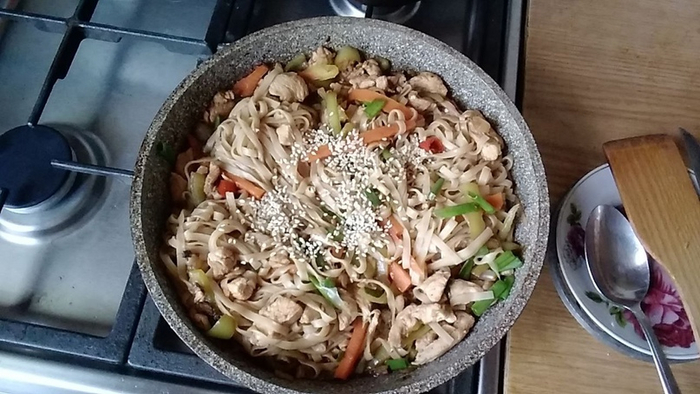 Подливаем воды в сковородку чуть меньше уровня лапши (не перелейте). Теперь осталось выпарить налитую воду.
