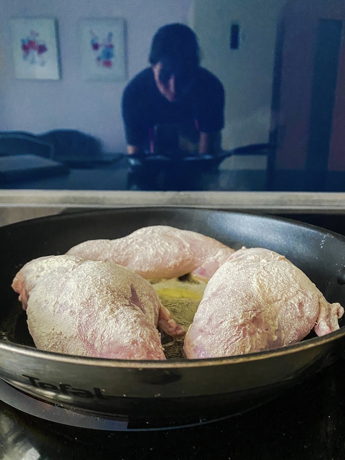 В паэльере начинаем процесс. На оливковом (а на каком же еще? Это жеш Испания) масле обжариваем курочку.