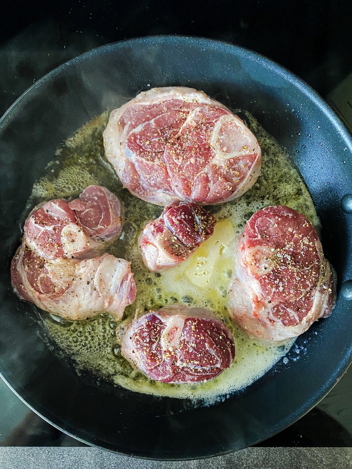 На сковородке разогреваем оливковое и сливочное масло (не засекла граммовки, кладите сколько позволяет талия совесть, это тот случай, когда кашу маслом испортить трудно) и выкладываем приправленное с обеих сторон мясо вниз той стороной, где диаметр кости шире.