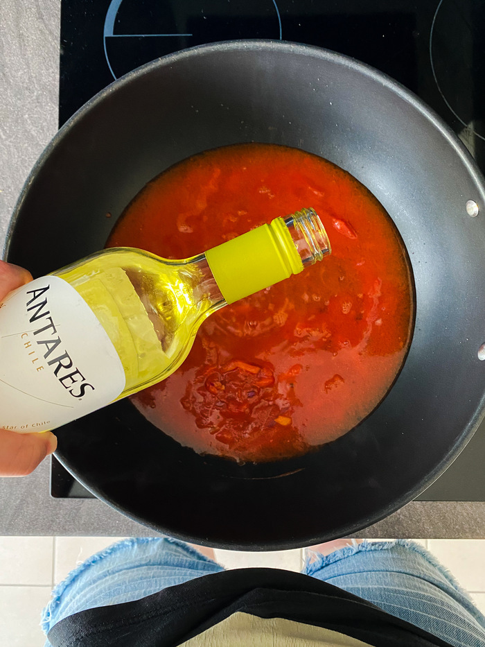 Вообще прелесть оссобуко в том числе в том, что это one pot meal, то есть готовится оно в одной посуде, но у меня у одной сковородки слишком низкие края, а у другой - дно узковато, поэтому я беру другую сковородку, а вы - перекладываете мясо в тарелку и используете ту же. Обжариваем морковь и лук, добавляем пассату (можно взять свежие помидоры, но не ленитесь снять кожу и вынуть семечки), томатную пасту, снова обжариваем. Добавляем вино и бульон, даем покипеть пару минут (вино добавляем то, которое пьем, чтобы не испортить вкус блюда).