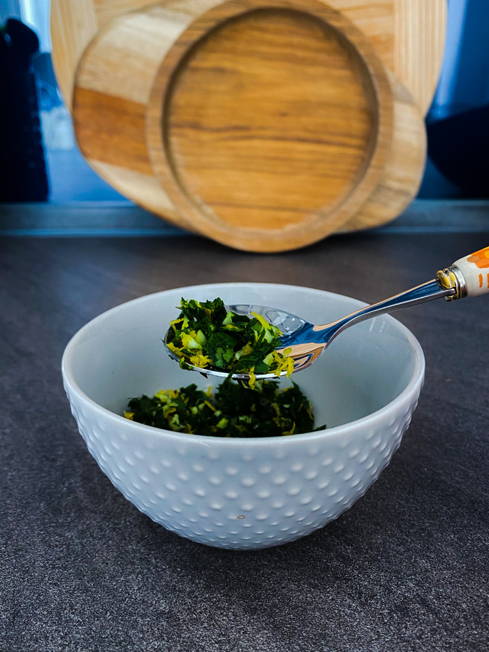 Все, уменьшаем огонь и оставляем на полтора-два часа, но не забываем: нужно проверять, что нет сильного бурления, голяшки закрыты жидкостью (если нет - подливайте бульон), а мясо проверять на готовность (готовность голяшки определяется по моменту, когда мясо «падает» с кости). За это время неспешно наливаем себе вина готовим картофельное пюре и гремолату. Для гремолаты мелко рубим чеснок и петрушку, натираем цедру, все смешиваем, солим.