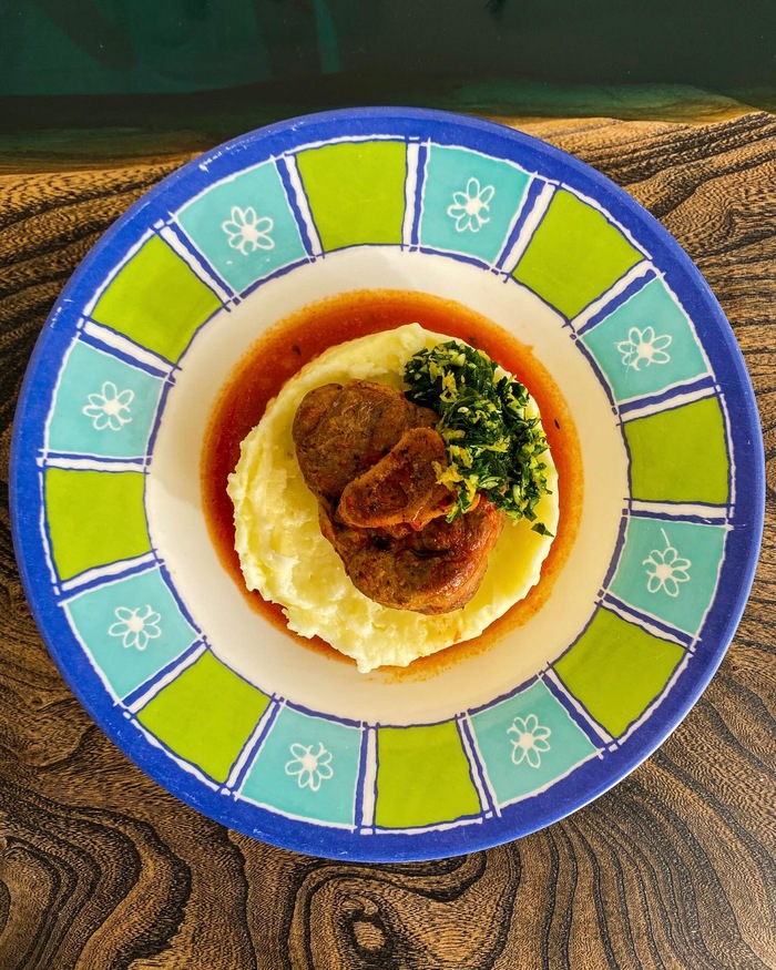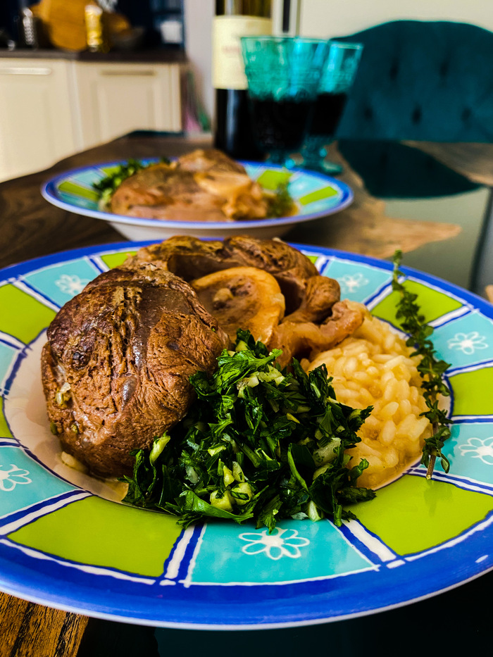 Собираем готовое блюдо исходя из собственных эстетических предпочтений - у меня сегодня так. Я позволила себе добавить одну из старых фоток оссобуко, чтобы показать, как это выглядит с правильной голяшкой.