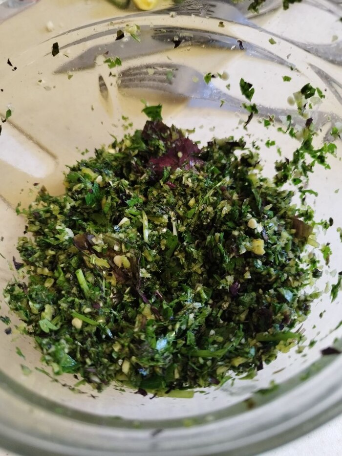 измельчаем зелень, чеснок и перец. Можно меленько порезать ножом, можно в блендере. Нам нужно порубить это все в труху, но не в кашу.