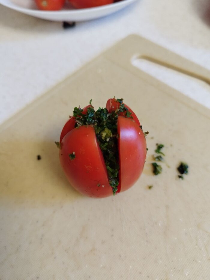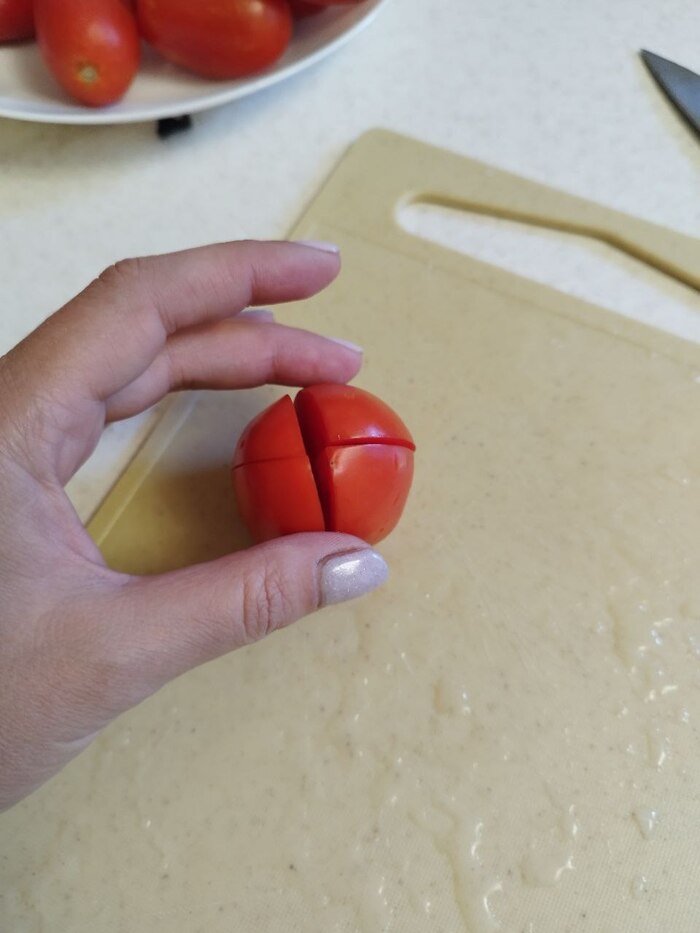 2. Моем помидорки, надрезаем каждый крест накрест, но так, что бы не до конца.