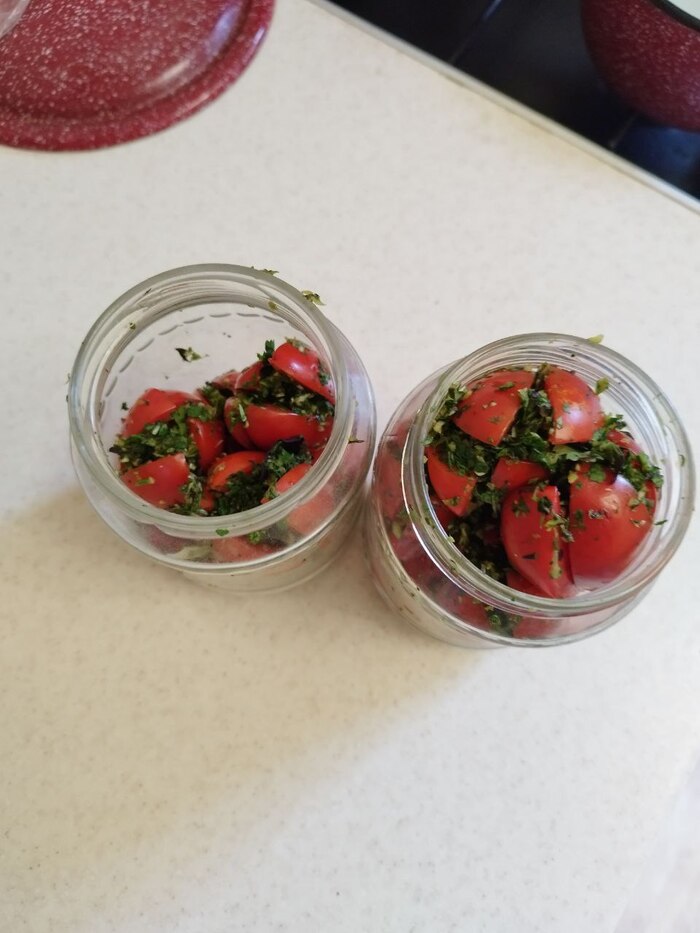 4. Теперь нам нужно установить помидорки так, что бы они все смотрели прорезями вверх, никуда не шевелились. Если вы не рассчитываете на долгое хранение, то ставьте все помидоры в один слой в емкости с бортами плотненько друг к другу. Я запихала насколько могла плотно в баночки, у меня нет других вариантов.