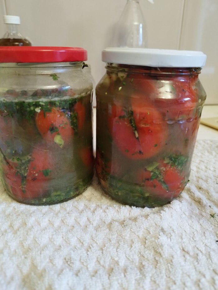 6. Заливаем рассолом наши помидорки. Если они в плоской таре, а не как у меня в баночках, старайтесь лить не на сами помидоры, а чуть сбоку. Что бы сразу не вымыть из них всю начинку. Какая-то часть листвы все равно всплывет, но основная масса должна остаться на месте.