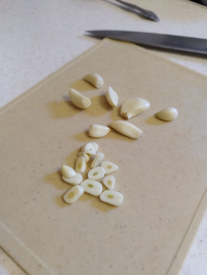2. чистим чеснок и режем его произвольно. А можно и не резать. Как вам больше нравится.