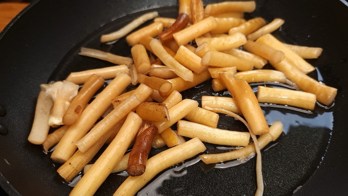 В этом варианте блюда будут использоваться только ножки опят, шляпки грибов мы засолим и замаринуем, но это уже совсем другая история.