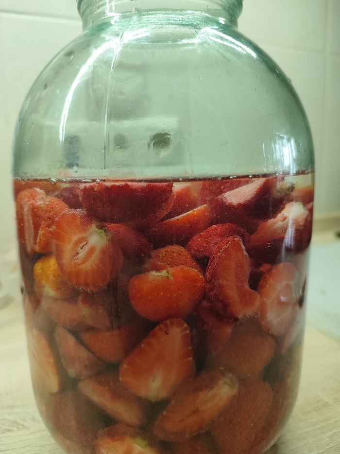 Итак, представляю вашему вниманию клубничную ратафию. Мой вариант по крепости наверное около 25 градусов, любителям крепкого можно сделать и 40 градусную, просто ниже опишу нюанс. Процесс долгий, но оно того стоило. Берем овердохрена клубники, желательно своей, ароматной и вкусной. По количеству так, чтобы заполнить очищенными от хвостиков половинками ягод трехлитровую банку. Я покупал 4 кг, но потратил на 3 вида напитков (клубничная ратафия, ксю-ксю и сливочный клубничный ликер, а-ля Бейлис), посему у меня вышло не на полную банку. А вот так:
