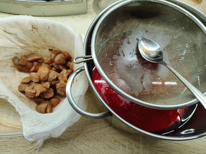 Сначала слил всю настойку через сито, убрав таким образом все зерна клубники. Потом пропускал через слои марли и дополнительно отжимал, т.к. кроме жидкости остается что-то типа желе (наверное пектин). Через ватный диск фильтровать вообще не вариант, встает сразу вся фильтрация.