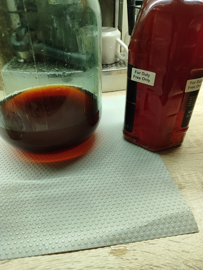 Смотрим, сколько вышло в литрах. У меня вышло около 1,5 литров. Теперь следующий этап: на каждый литр настойки варим сироп из расчета 100гр сахара на 50 мл воды. Доводим до кипения, минут 5 кипятим, остужаем до комнатной температуры и добавляем в нашу настойку, тщательно размешиваем до полного растворения, т.к. сироп при охлаждении начинает густеть. Поздравляю, первый вариант практически готов, но надо, чтобы она отдохнула в бутылке хотя бы неделю.