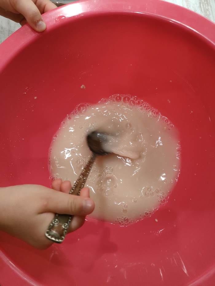 Можно привлечь бесплатный детский труд к этому процессу. Получается вот такая жижа. Потом в нее я лью две столовые ложки оливкового масла и начинаю добавлять муку. Не надо бахать всю муку сразу, вводим постепенно. Сразу скажу, я ввожу муку на глаз, но примерно это 250 грамм. Со временем я отказался от взвешивания муки, так как каждый раз ее нужно разное количество и ориентируюсь я исключительно на консистенцию теста. Когда искомая консистенция будет достигнута, муку класть я прекращаю. Добавляем муки с полстакана и мешаем столовой ложкой, потом ещё и ещё пока не перестанет липнуть к рукам. Лишнюю муку тоже сыпать не нужно, муки нужно столько чтобы вот если чуть-чуть убрать, и тесто начнет липнуть. Как только перестало липнуть, посылаем стол щипоткой муки и начинаем вымешивать, слегка растягивая и складывая обратно тесто. Минут 10. Получается вот такое: