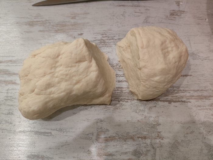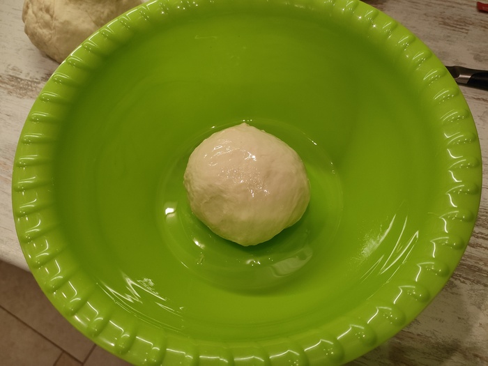 Кусочек справа это на пиццу 30 см. Кусок слева я порежу пополам и уберу в холодильник, накрыв фольгой или пищевой пленкой. Их можно будет брать в течение пары дней на пиццу поменьше. Но прежде их нужно руками собрать в шарики. Затем беру какую-то ёмкость, капаю вниз каплю подсолнечного масла, шариком размазываю это масло по стенкам и убираю в холодильник.