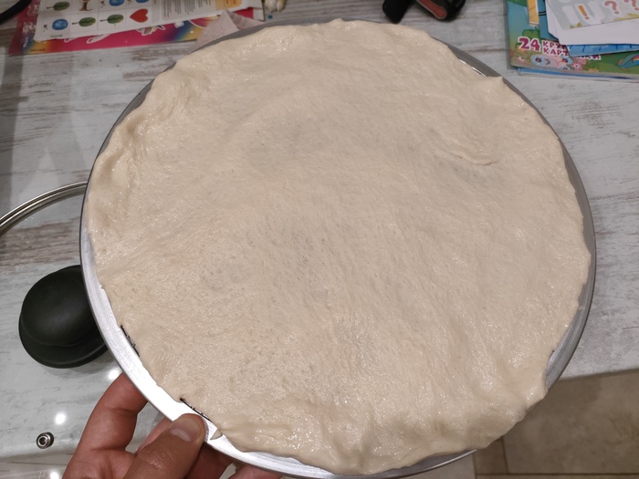 Небольшой лайфхак. Чтобы тесто не липло к рукам, капаем на ладони каплю подсолнечного масла. Я не раскатываю тесто скалкой и не выкладываю его на стол, как делают многие. Мне нравится на весу его растягивать, но тут нужна сноровка. Возможно не у всех сразу получится. Попробуйте для начала делать это на столе. Если есть манная крупа, посыпьте ею тесто сверху обильно, а стол мукой и просто переверните миску с тестом на стол с мукой. Оно само вывалится. Не вынимайте его руками силой. А дальше от центра к краям растягивайте тесто и переносите на форму. Повторюсь, мне удобнее делать это на весу.