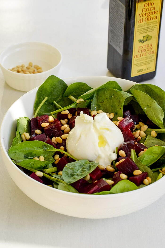 Салат из запеченной свеклы со шпинатом и бурратой