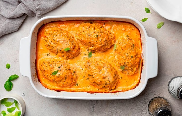 5) Возвращаем форму в духовку еще на 40 минут. Для подачи дополняем голубцы свежими овощами, маложирной сметаной или натуральным йогуртом.