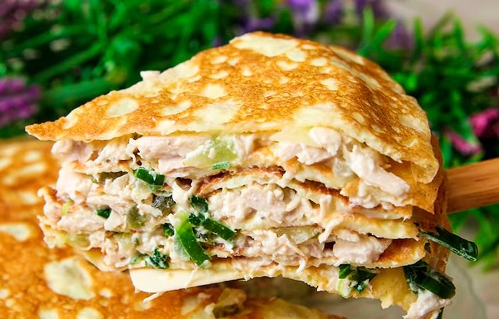 5) Когда блины немного остынут, собираем торт. Каждый блинчик щедро промазываем начинкой из куриного филе.