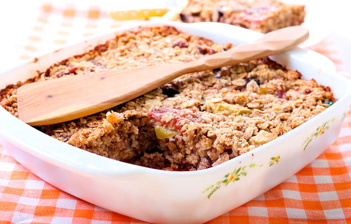 4) Разогреваем духовку до 180 градусов. Переливаем овсяную смесь в форму, отправляем запекаться на 30–35 минут.