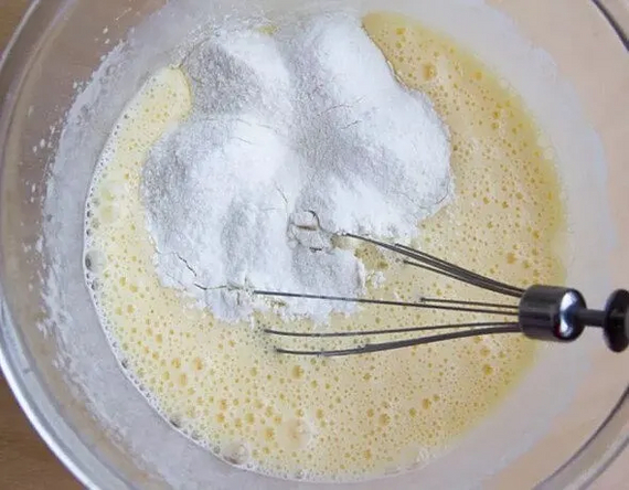 Затем посыпаем крахмалом. Добавляем фарш. Все хорошенько солим, перчим, можно выдавить свежий чеснок или добавить сушеный молотый. Перемешали и вперед жарить.