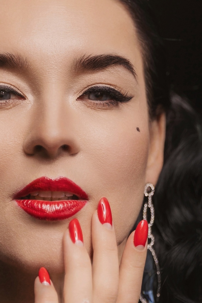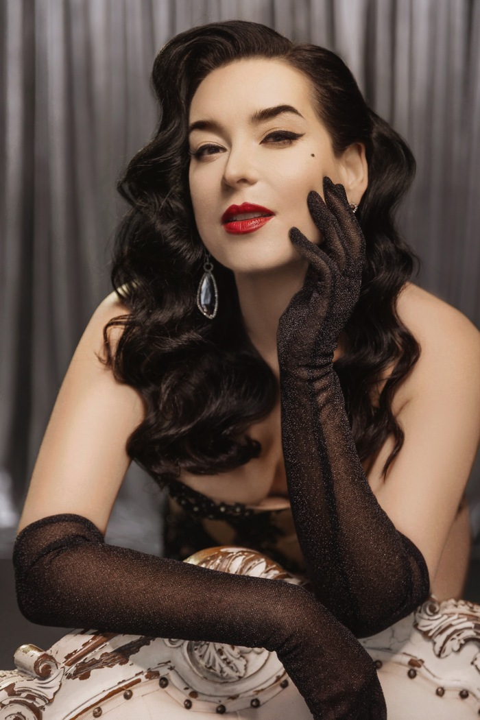 Чулочки и фарфоровая кожа, изящная волна черных волос, тоже характерные черты амплуа Диты фон Тиз. Цвет глаз я меняла с помощью линз, кожу высветлили тоном, грим добавляли на нос.