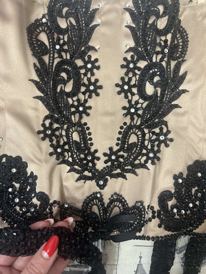 Костюм обшит и расклеен мною вручную. Корсет, два разных по форме лифа, трусики, пояс, чулки) По времени ушло где-то недели две, с учетом того, что делалось это вечерами после работы)