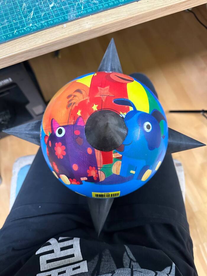 Моргенштерн изготавливала из детского мячика. Конусы напечатала на 3D принтере. Для легкости конструкции так же использована пластиковая цепь.
