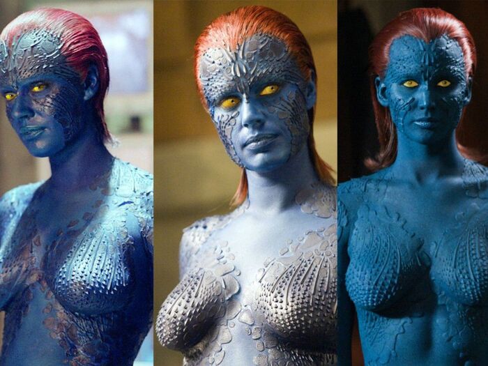 Процесс наложения грима Ребекке Ромейн на съемках фильма "Люди Икс", США, 2000 год.