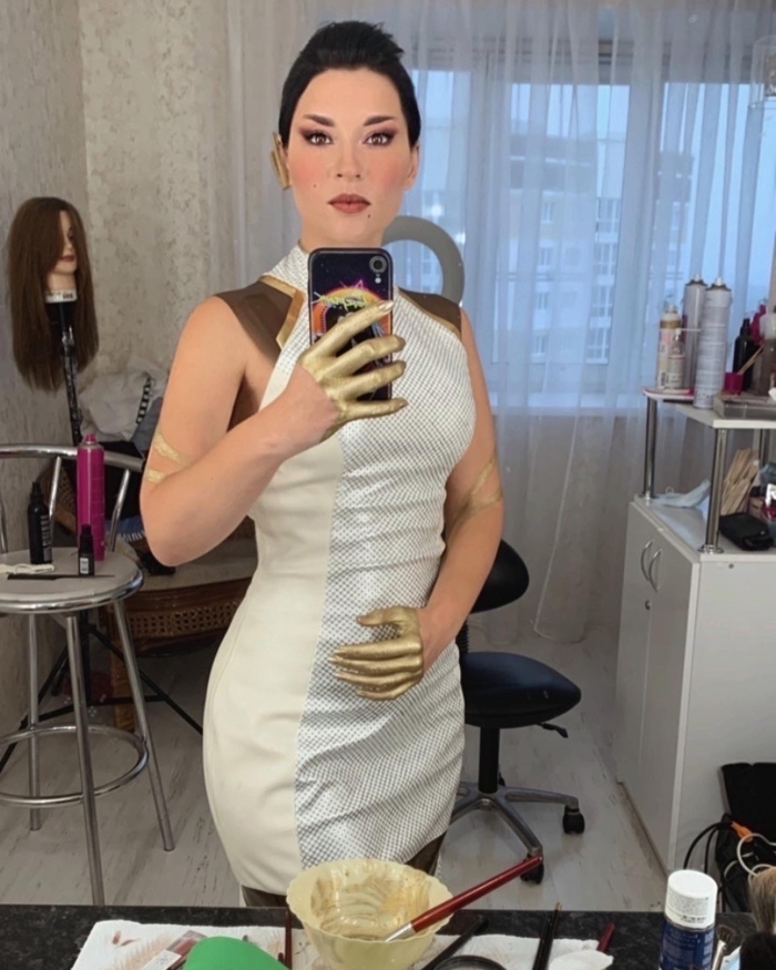 Полоски на руках и ногах и кисти разрисовали краской для боди - Арт. Краска специально для создания эффекта металических поверхностей, криолановская. Ложится хуже, чем та бронзовая, что использовали в косплее на Анксунамун.