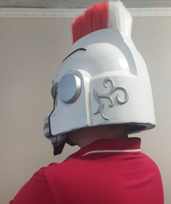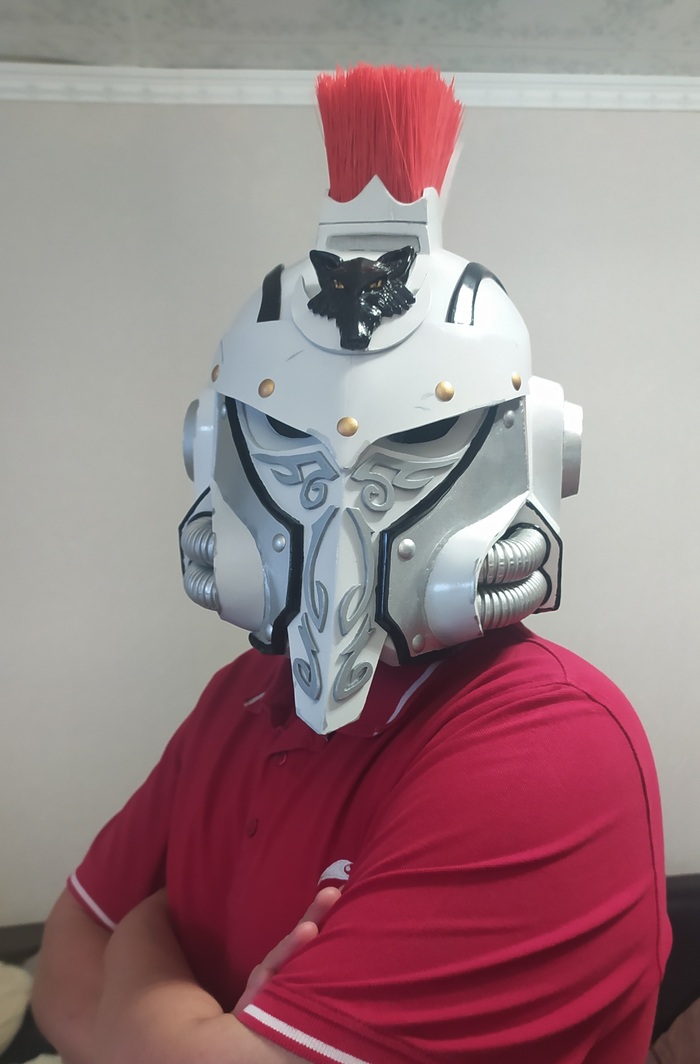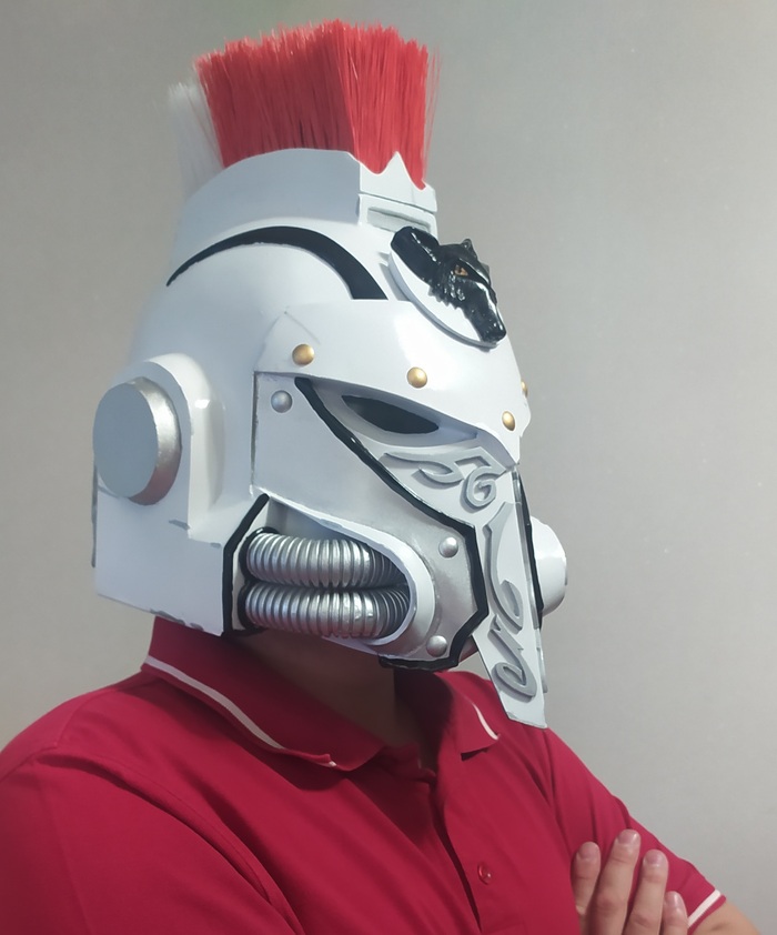 Вот он готовый шлем астартес из Лунных волков. Шлем именной принадлежит Рагвелю Локену. Капитану 10-ой роты косморей. Шлем доересевый. Когда император такой молодой и Ересь впереди. Шлем загрунтован, окрашен в металик, после в белую сатину и вручную расписан красками Тамия, покрыт глянцевым лаком. Шлем изготавливался около 3 месяцев с перерывами. Внутри окрашен в черный и добавлены наклейки-подушки. Масштаб позволяет спокойно носить шлем на голове. На фотка сам автор шлема =)