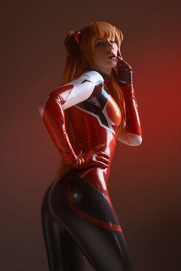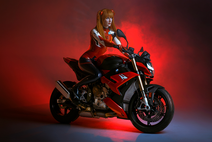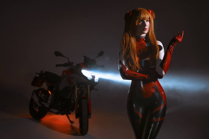 Аска Ленгли пилот боевого робота и носит эффектный комбинезон -> на артах и фигурках часто изображают на мотоцикле -> водителей мотоциклов также называют пилотами и они тоже носят эффектные комбинезоны -> отличный вариант, чтобы отснять Аску с мотоциклом.
