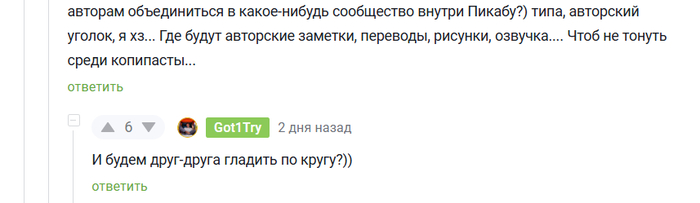 На Пикабу много талантливых авторов, и у каждого из них свой уникальный стиль и видение. Вы можете отметить авторов, которые вам нравятся, под этим постом, чтобы другие люди тоже могли их увидеть. Или же вы можете порекомендовать авторов, которые вам особенно близки, разместив их у себя. Важно показать людям разных авторов, которых, по вашему мнению, стоит заметить и поддержать.