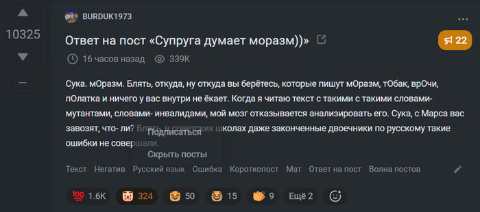 А к чему я всё это? Да просто тупо смотрится это поучительство от тех, кто сам далёк от идеала. У меня по-любому тоже есть ошибки, хоть я и стараюсь. Действительно лучше писать грамотно. Но не стоит на говно изводиться в отдельный пост за ошибку и называть всех ошибающихся долбоёбами. Тем более в случае, если сам не выдерживаешь своей же критики.