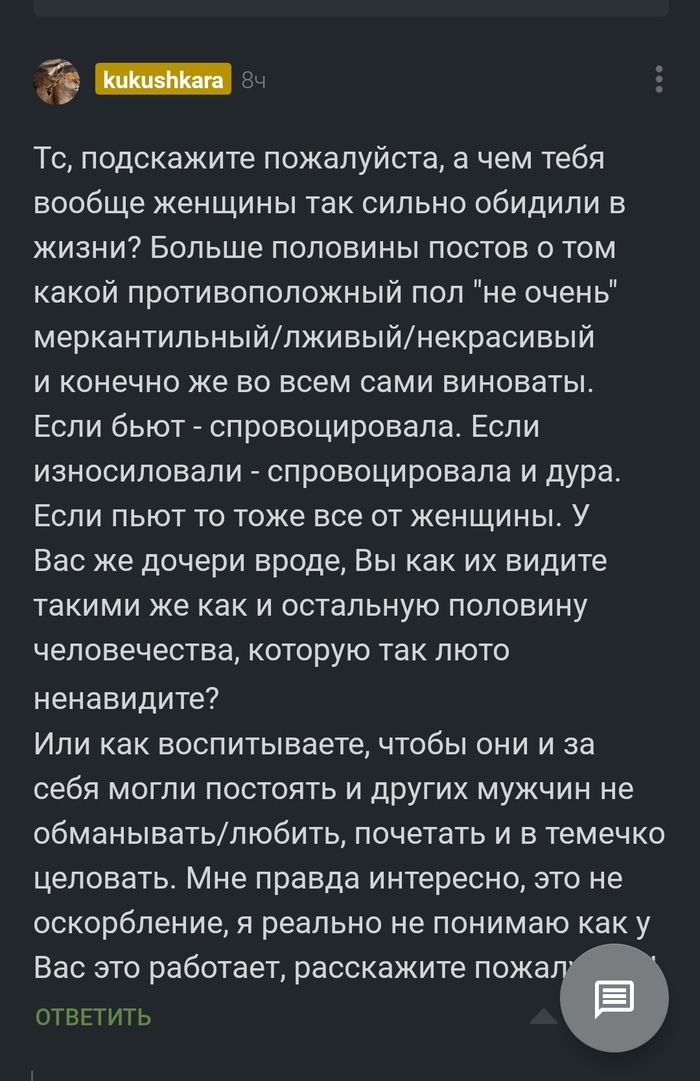 Будет длиннопост. На пикабу я давно и занимаю позицию читателя или наблюдателя, в войне полов не участвую, но тут подгорело у меня так сильно, что пятая точка покрылась вулканической пылью. А началось моё знакомство с данным автором с его последнего ответа на пост: Ответ на пост «Таксисту-мигранту из Таджикистана за изнасилование 16-летней девушки - Сократили срок с 8 лет до 3,5»