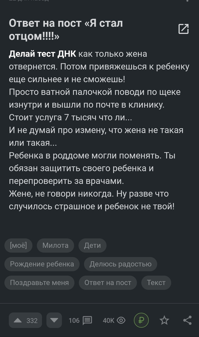 Уж тыж))) жирно! Мужчина в исходом посте радуется, что стал отцом. Автор советуют делать тест и внимание!!! Жене ни в коем случае не говорить? А может ли быть такое, что у них нормальные отношения и супруги могут это обсудить? Мне не понятно.