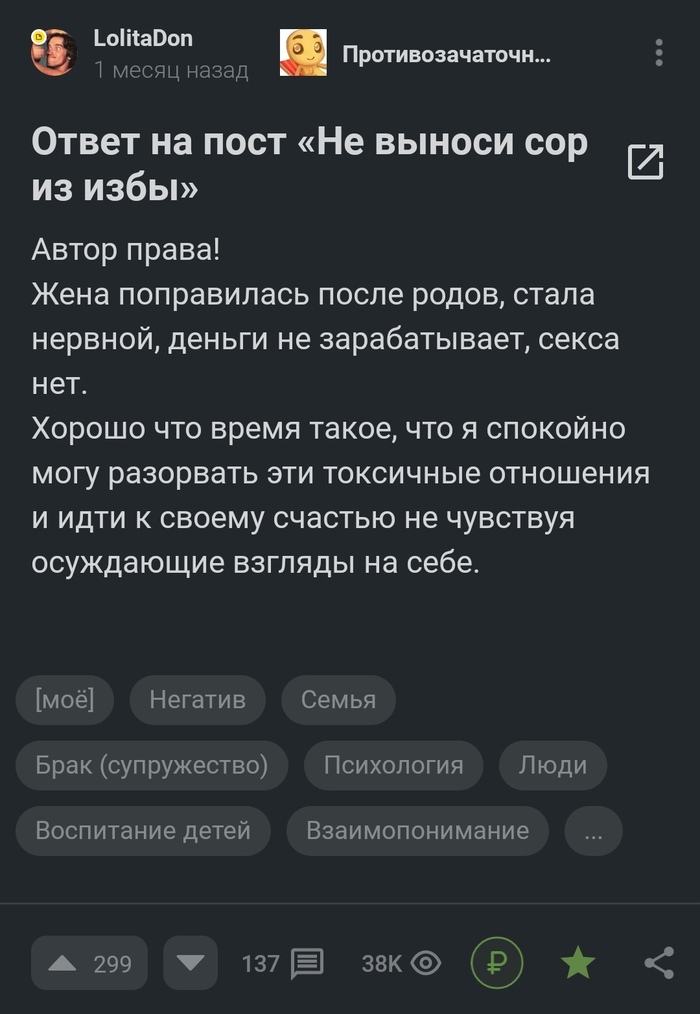 Ребят и тут знаете что странно, автор то женат и что ещё интереснее у него двое дочерей. 14 и 11 лет. Автор их любит, делится достижениями. Вот мне интересно а его супруга и дочери видели его посты? Какое у них мнение на этот счёт? Но наверняка это совсем другое. Там он видимо примерный семьянин, а женщин только на пикабу ненавидит. НО... Вот вам ещё пост с кричащим названием: