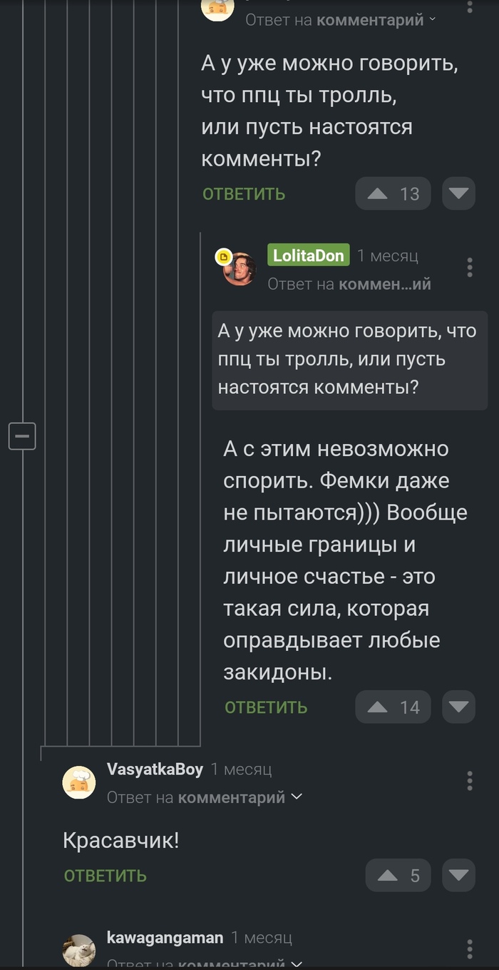 Я вот например с удовольствием смотрю разборы феменисток-радикалок от @Balu829. Грамотно, доходчиво, по делу. Он нежно обращается а оппоненткам - "милая барышня", когда я сижу и кручу пальчиком у виска на очередной высер от фиминисток. Он аргументирует и не скатывается в унижения. Его смотреть приятно и интересно.