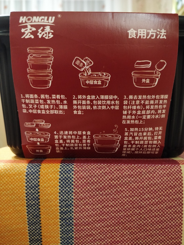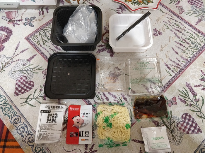 3. Во внешний контейнер кладём нагревательный элемент, предварительно вытащив его из внешней упаковки, заливаем его водой из пакетика поменьше (с оранжевыми иероглифами), ставим в него внутренний контейнер, накрываем его крышкой, на крышку кладём все пакетики с соусами и прочими съедобными добавками и завязываем пакет.