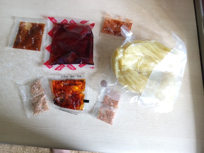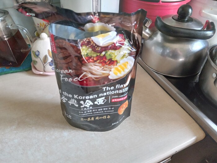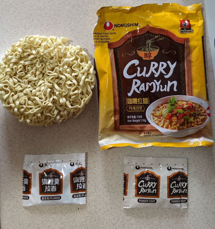 Приступаем к приготовлению. На странице продавца инструкция говорит нам одно, а перевод с упаковки другое. Поэтому готовить будем, руководствуясь инструкцией от производителя. Она советует нам проварить лапшу в течение двух минут, после чего слить воду и добавить содержимое всех пакетов. Так и поступим. После всех манипуляций получаем такую картину.