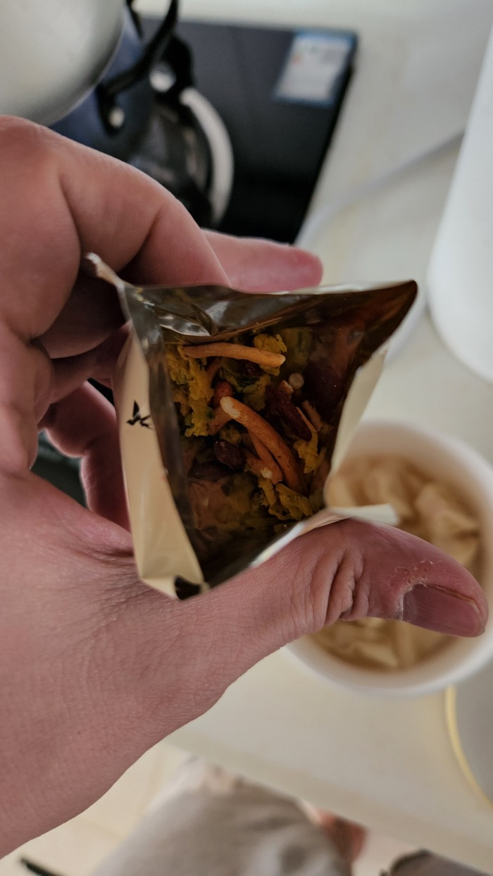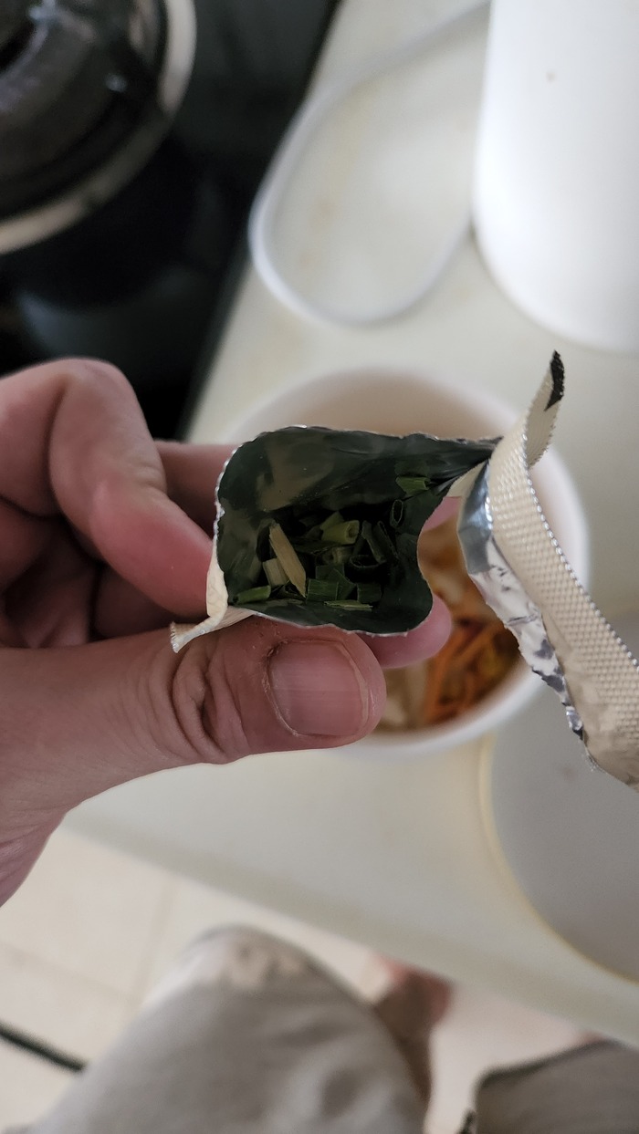В первом пакете с добавками находится сухой бульон. Бледный и невзрачный, но обалденно пахнет вареной курочкой и китайскими специями.