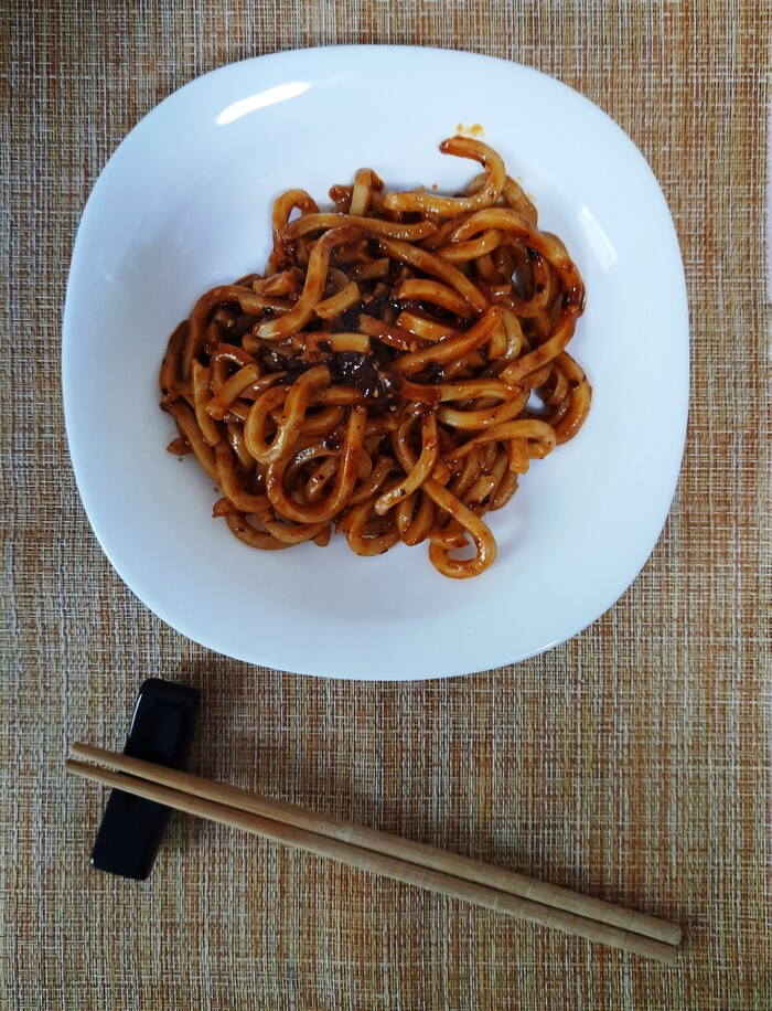 На вид порция кажется не очень большой, но, забегая вперед, скажу, что она сытная и достаточна, чтобы утолить голод. Как видите, соотношение лапши и соуса идеальное. Лапша не плавает в соусе, но вся хорошо с ним соединилась. Удон получился толстый и плотный. Вкусный. Сильно напоминает хорошую домашнюю лапшу. Ставим плюсик. Соус интересный и вкусный. На первых ролях выступает достаточно сильный арахисовый вкус, после которого в игру вступает небольшая сладость. Затем мы ощущаем аромат пряностей и остроту. Причем острота раскрывается постепенно и от уровня в 1-2 красных Дошика в начале достигает уверенных 4 Дошиков к концу. Мне очень нравится сочетание сладкого и острого, поэтому еще один плюс поставлю за соус. Возможно кому-то соус может показаться жирноватым, но это уже дело вкуса.