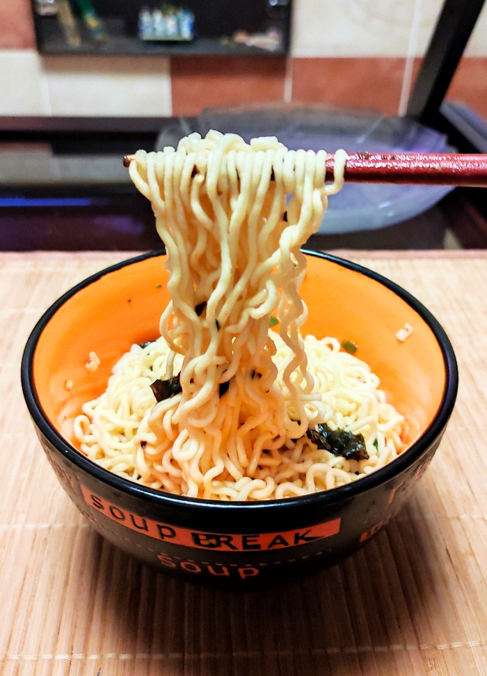 Порция получилась солидного размера. Достаточная для насыщения даже голодного мужчины средних лет и телосложения. Кроме того блюдо весьма привлекательно выглядит, на мой взгляд. После заваривания у лапши появился жареный аромат. Порошковый соус ушел запахом от шоколада в сторону специй. А что же на вкус? Ребята, это просто бомба! Ничего подобного я никогда не пробовал. Прекраснейшая лапша, несмотря на то, что тонкая, сохранила упругость и добавила к собственному поджаренному вкусу аромат соуса. Вкус для меня совершенно новый и незнакомый. Постараюсь описать его как смогу. Очень отдаленно напоминает вкус соуса чачжан, но более сложный и интересный. Сначала ощущается приятная ненавязчивая сладость, затем раскрываются специи и чуть заметная кислинка, в послевкусии очень деликатная острота в пределах четверти красного Дошика. Майонез разошелся по всей лапше и особо не ощущается, но вносит свою лепту в общую картину вкуса. Также весьма хороши сушеные овощи. Капустка увеличилась в размерах и придала приятную хрусткость блюду.