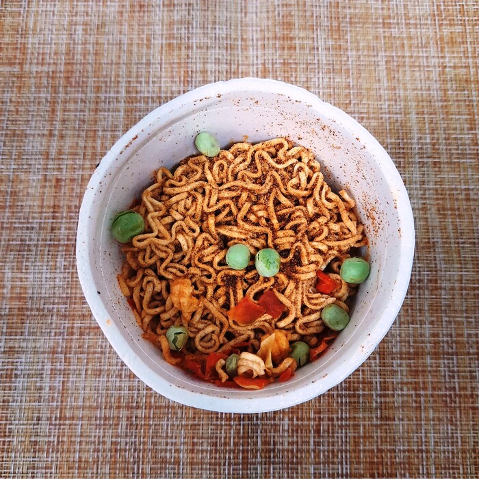 Заваривается всё очень просто. Открываете, достаете один единственный пакетик с приправой и высыпаете его содержимое в сухую лапшу (вакаме и камабоко находятся сразу в лапше). Далее заливаете кипятком, накрываете и ждете 3 минуты, пока заварится лапша.