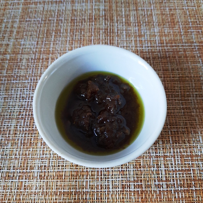 Приличная порция соуса чачжан. Соус почти черный, с ярко-красным маслом. На вкус чуть сладковатый, с выраженным вкусом бобов и значительной остротой. Запах обычный, как и у других представителей. Масло вскрывать и пробовать не стал, т.к. что там может быть интересного?
