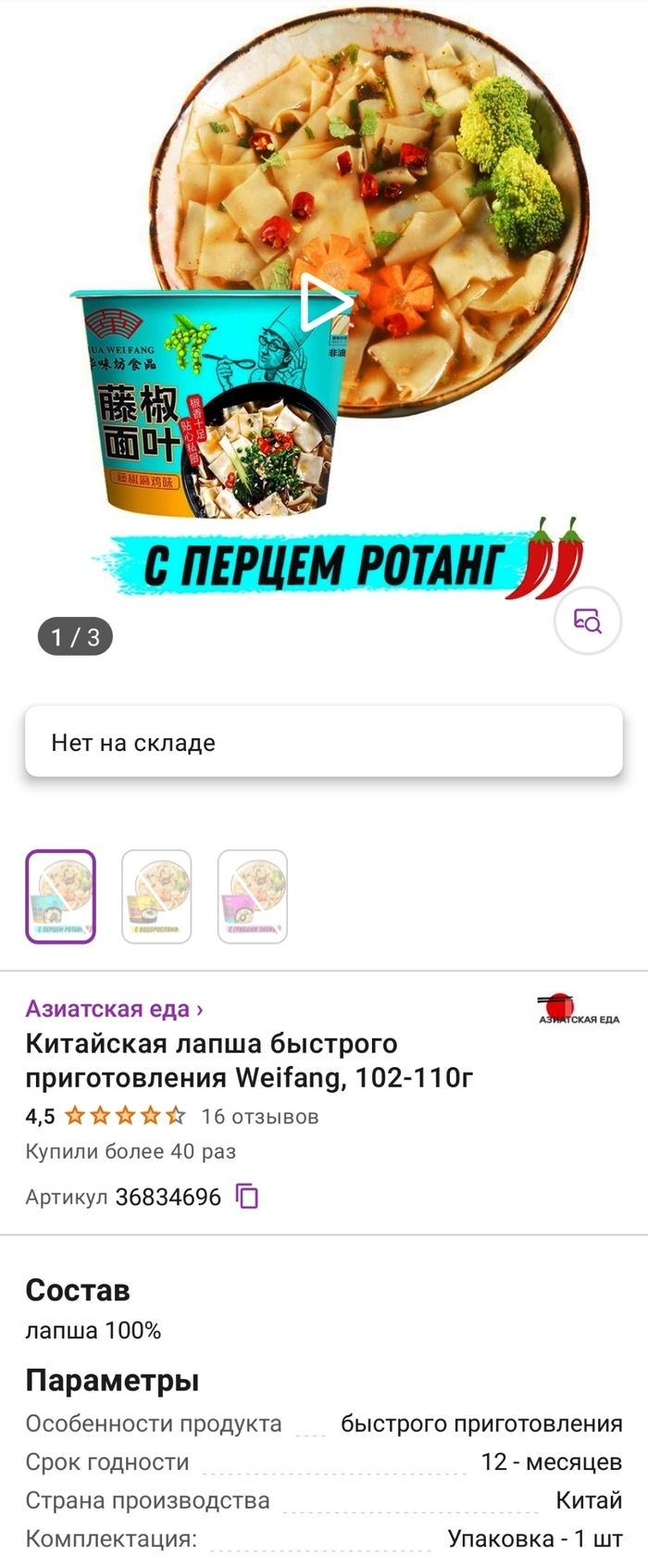 Здравствуйте, друзья! В этот прекрасный субботний денёк продолжаю дегустировать образцы лапши быстрого приготовления и сегодня пробую лапшу с перцем Ротанг HUA WEI FANG. Данная лапша была приобретена достаточно давно и благополучно забыта в глубинах моего лапшехранилища. Совершенно случайно наткнулся на нее и решил, что настало ее время. За давностью не могу припомнить где и по какой цене она была куплена. Поискав в интернете, нашел ее на Wildberries, но в наличии товара нет, поэтому цену выяснить не удалось. Коллега @Alexx1977 упоминал данную лапшу (а точнее супчик) в своем обзоре, но я тоже внесу свои 5 копеек. Кстати он же называет цену в 60 рублей (но это на Дальнем Востоке). У нас в Сибири таких цен не встречал. Вступление что-то затянулось, перейдем уже к нашему подопытному. Упакован он в небольшую картонную чашу с фольгированной бумажной этикеткой. Как обычно информация на чаше на китайском языке. Присутствует стикер на русском.