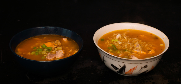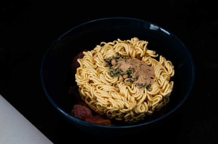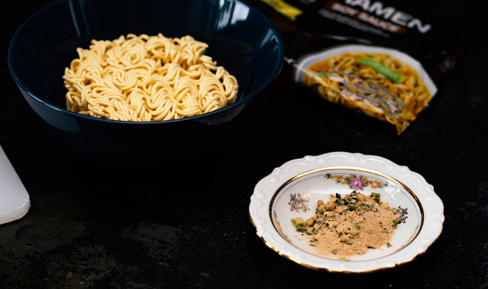 Добавляем соус. Не буду специально искать в соусе кусочки соевого текстурата, скажу просто что они там были, есть, и скорее всего будут. По сути это один из немногих рамёнов, которые достаточно неплохи даже в изначальном виде, без добавок.
