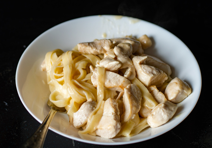 Понятно, что хотя альфредо и можно сделать только с соусом, без куриной грудки это какая-то совсем ерунда. Да собственно как и дошик без добавления какого-нибудь мяса. Отрезал половину куриной грудки, нарезал, смазал нагретую сковородку сливочным маслом. Ну то есть просто вынул кусочек из морозилки и провёл по сковороде - так получается совсем тонкий слой. Куриную грудку туда же - и обжаривать. А спустя буквально минуту и макароны, следом незамедлительно соус. Собственно, на фото видно сырые ещё кусочки курицы обжаренные с одной стороны.