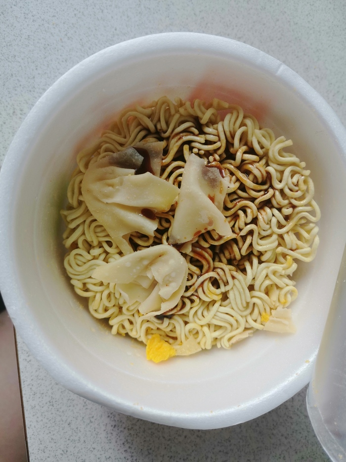 "Жёлтая штука - похожа на комок разваренного паштета, вкус приемлемый, консистенция губки, пористая.Лапша хорошая, достаточно твердая